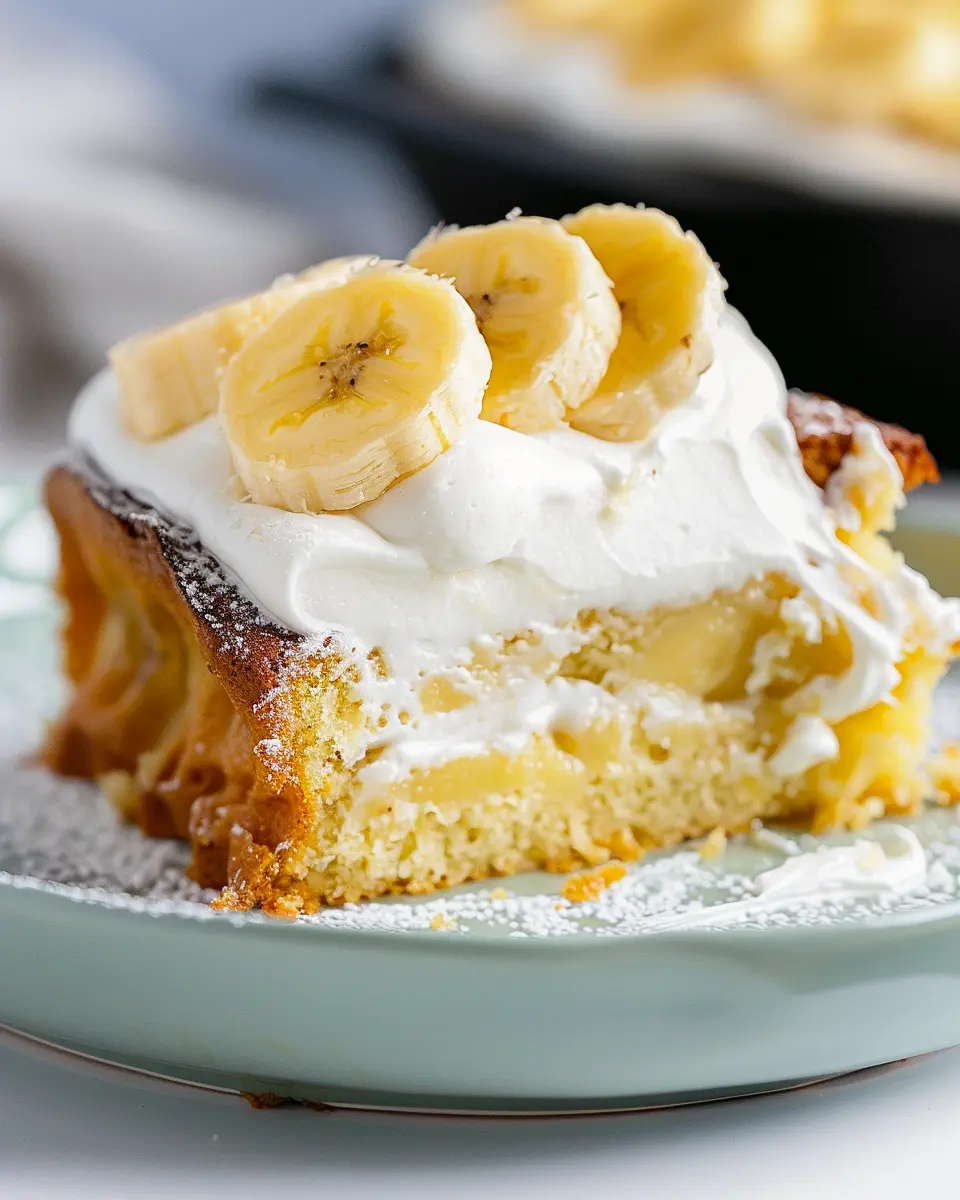 For the final delicious touch, consider garnishing with sliced bananas, crushed nuts, or a sprinkle of cinnamon. Your Air Fryer Banana Poke Cake is now ready to impress; slice it up and share with family or friends!