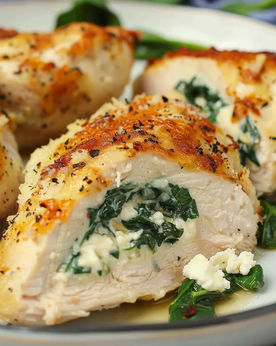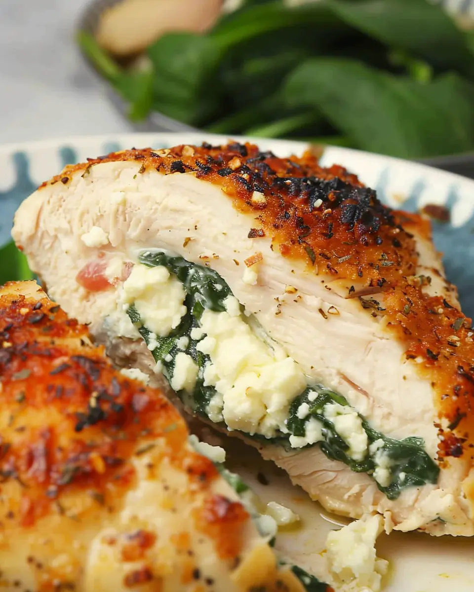 - Slice each chicken breast to create a pocket, then stuff with the spinach and feta mixture.