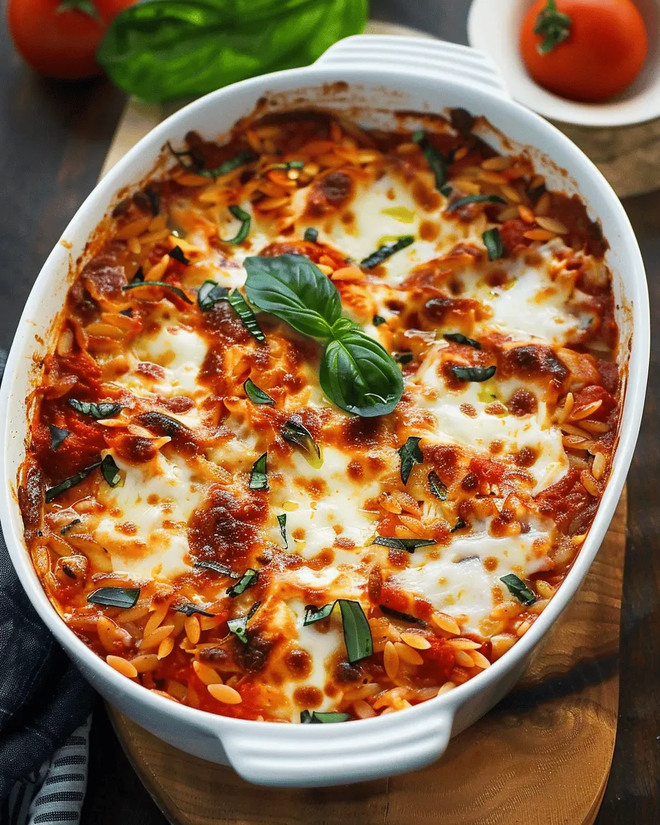 What’s a baked dish without gooey cheese? Tear 1 cup of fresh mozzarella into small pieces and sprinkle it generously over the top of your assembled orzo dish. Fresh mozzarella not only melts beautifully but also forms a tantalizing golden crust that gleams when you pull it out of the oven. If you adore cheese as much as I do, consider adding a touch of parmesan for an extra layer of flavor!