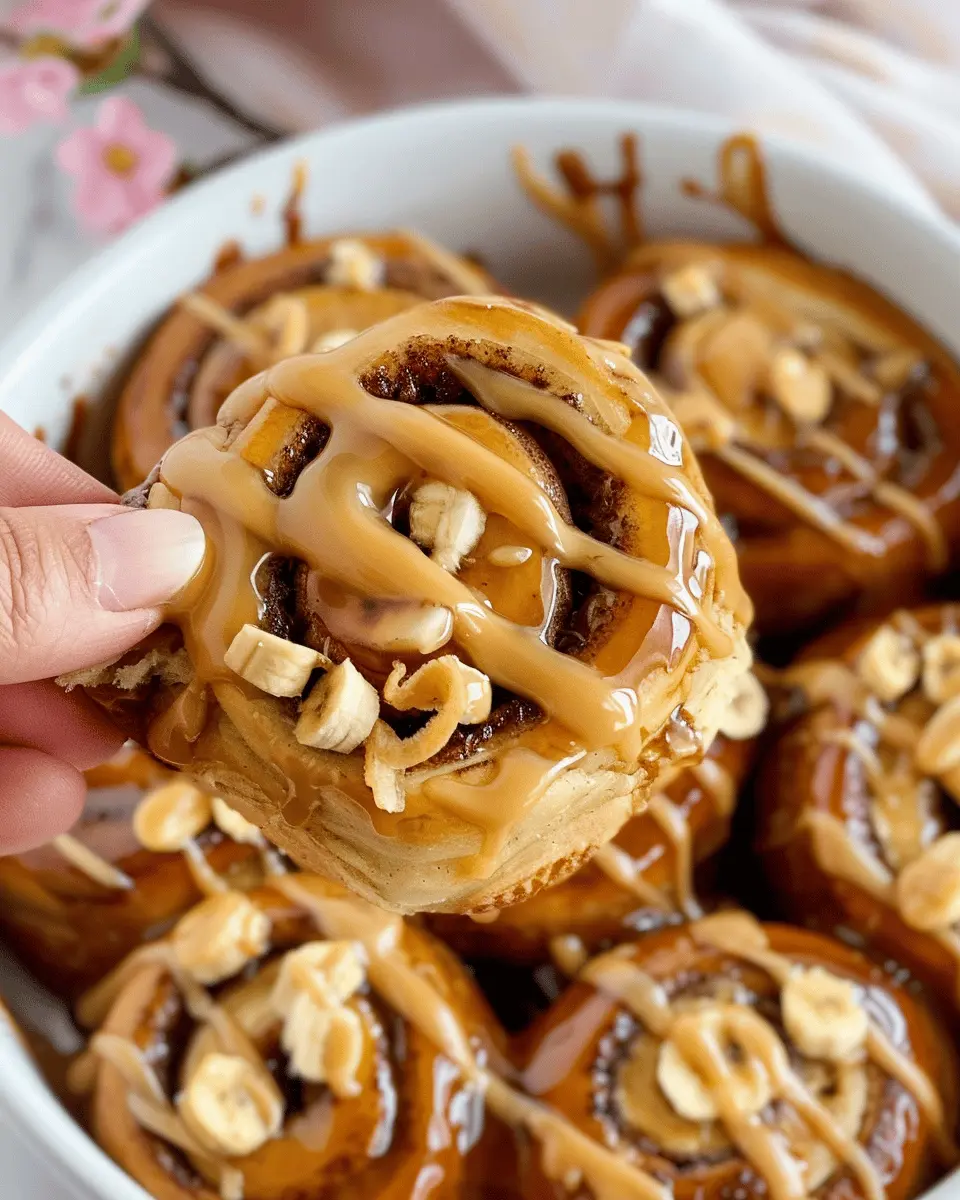Let your banana bread cinnamon rolls cool slightly before adding the drizzle. To create the peanut butter topping, simply combine peanut butter with maple syrup and stir until smooth. Drizzle generously over the warm rolls.