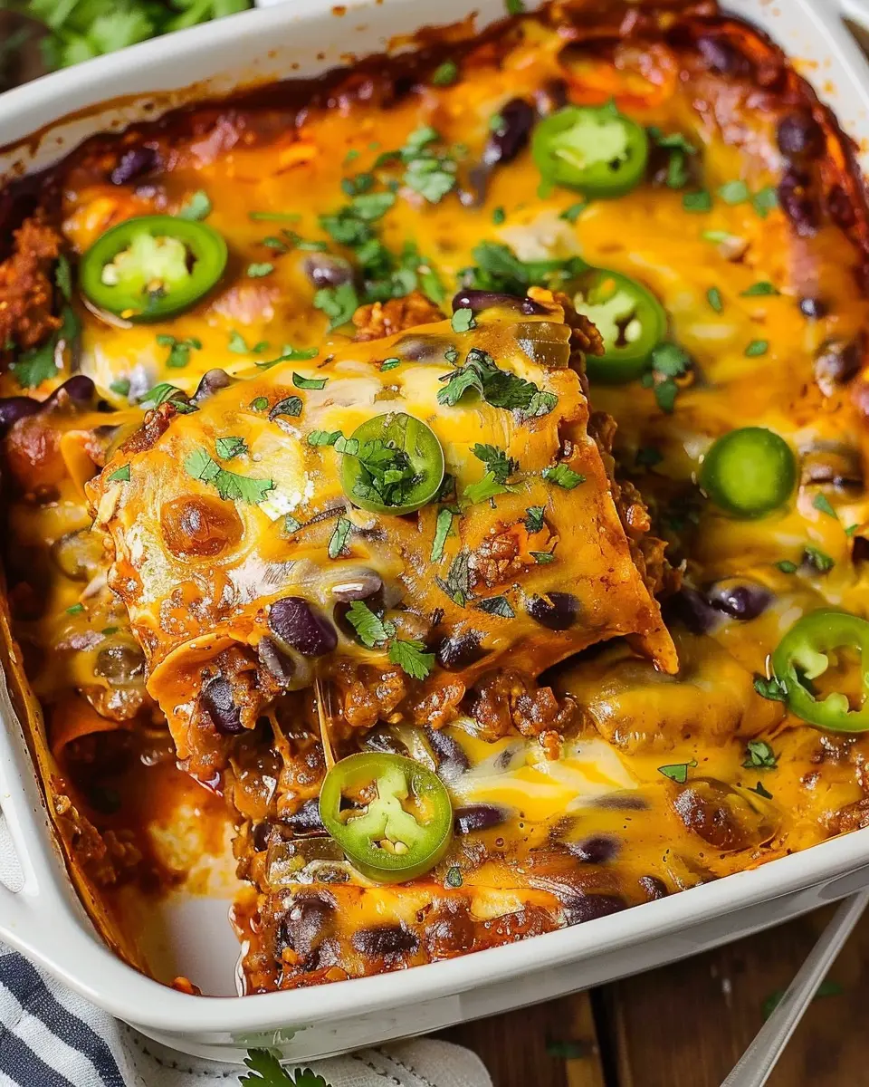 A delightful and cheesy beef enchilada casserole that will warm your heart and fill your stomach.