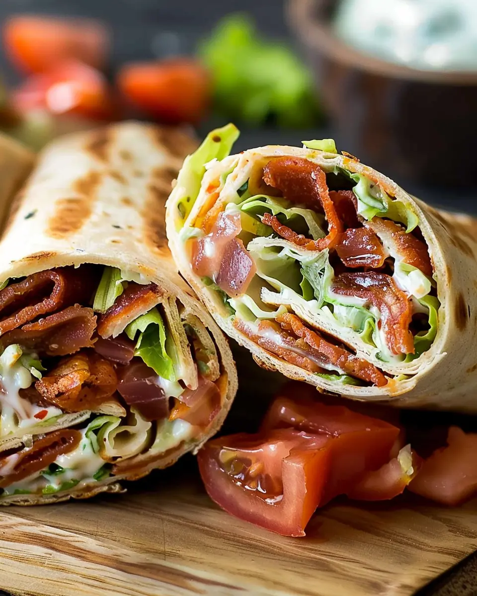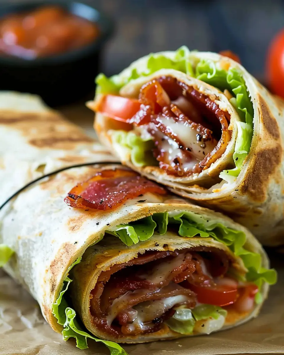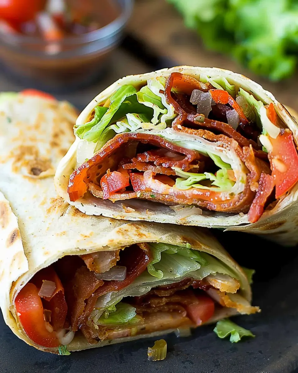 This recipe for BLT Wraps with Secret Sauce combines crispy bacon, fresh lettuce, ripe tomatoes, and a unique secret sauce, all wrapped in a soft tortilla for a delicious meal.