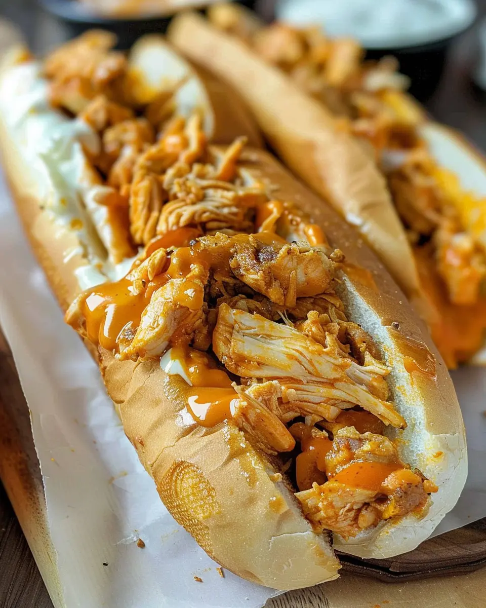 Now on to the fun part: assembling your buffalo chicken cheesesteak! Take your sub rolls and spoon the chicken mixture evenly into each one. Don’t be shy; pile it high! After that, dollop some cream cheese on top, followed by a generous handful of shredded cheese. Feel free to get creative here! Maybe add some jalapeños for extra heat or even a sprinkle of blue cheese if you’re feeling adventurous.