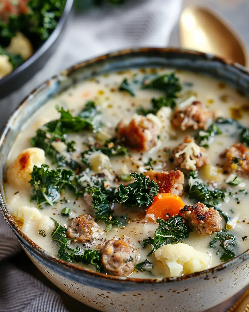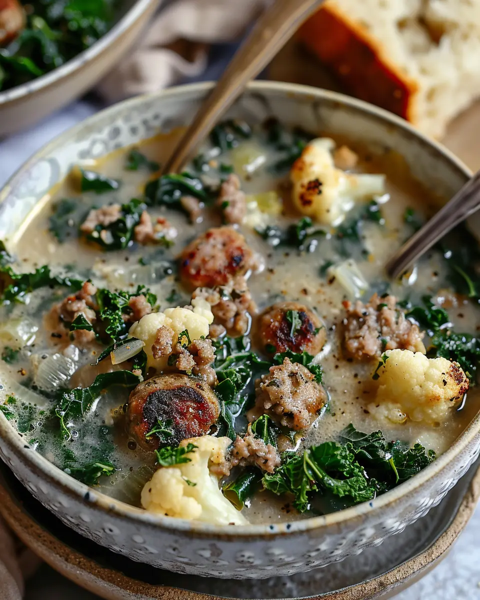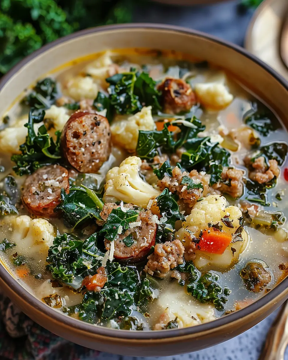 A warm and hearty soup combining the flavors of cauliflower, sausage, and kale, perfect for chilly days.