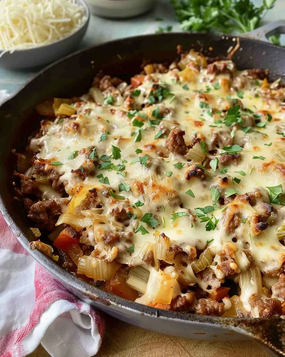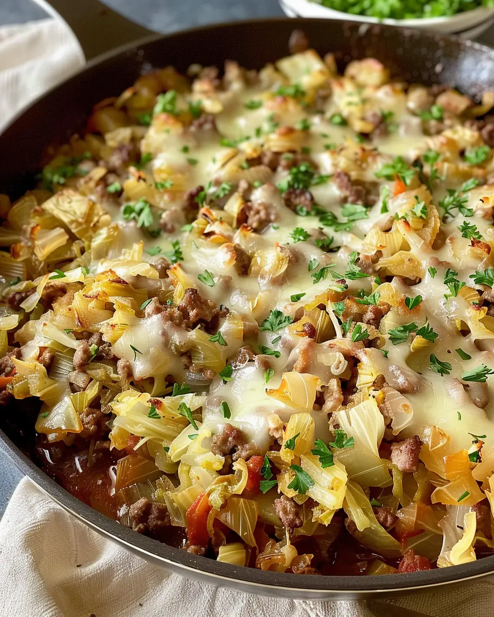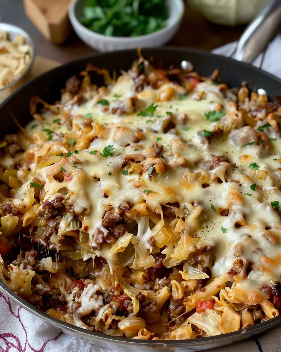 A delicious and comforting cheesy beef cabbage skillet that is quick to make, perfect for family dinners.