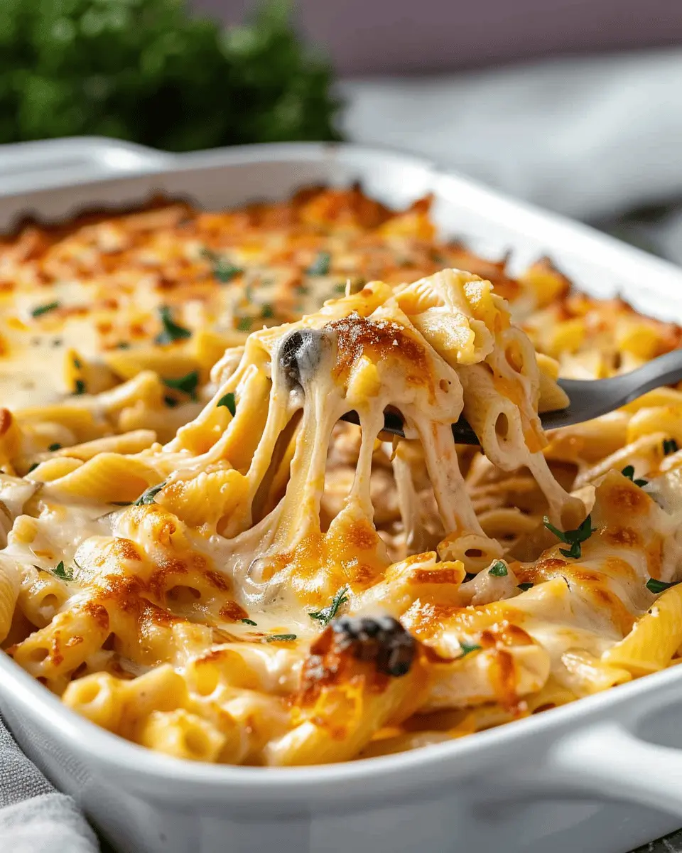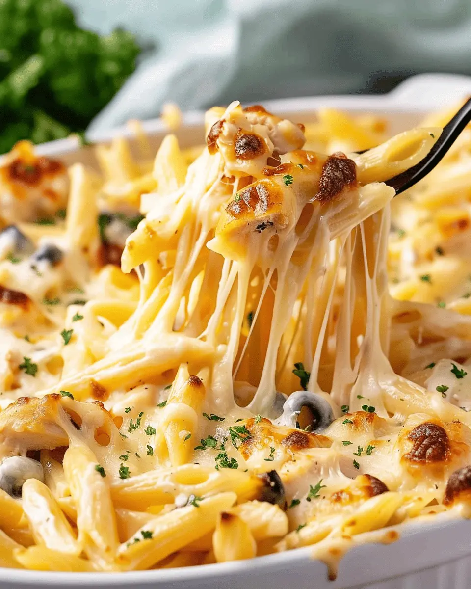 A comforting and delicious cheesy chicken pasta dish that features turkey bacon, perfect for a cozy dinner.