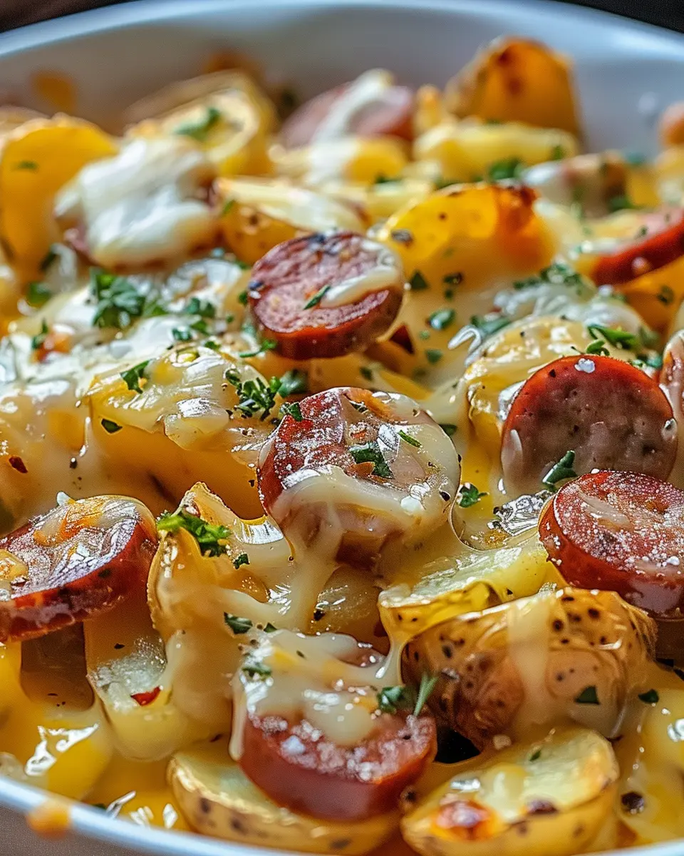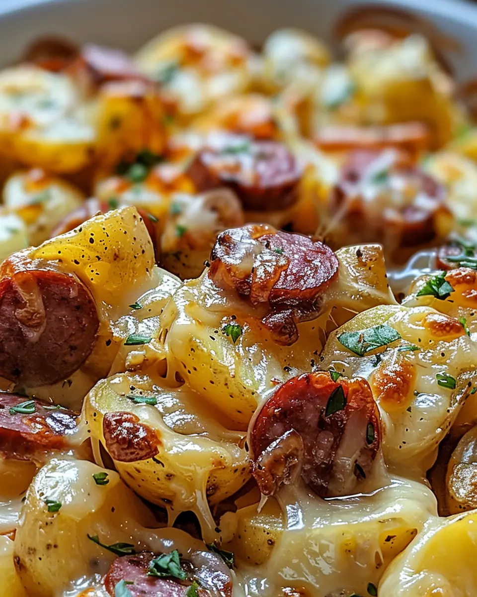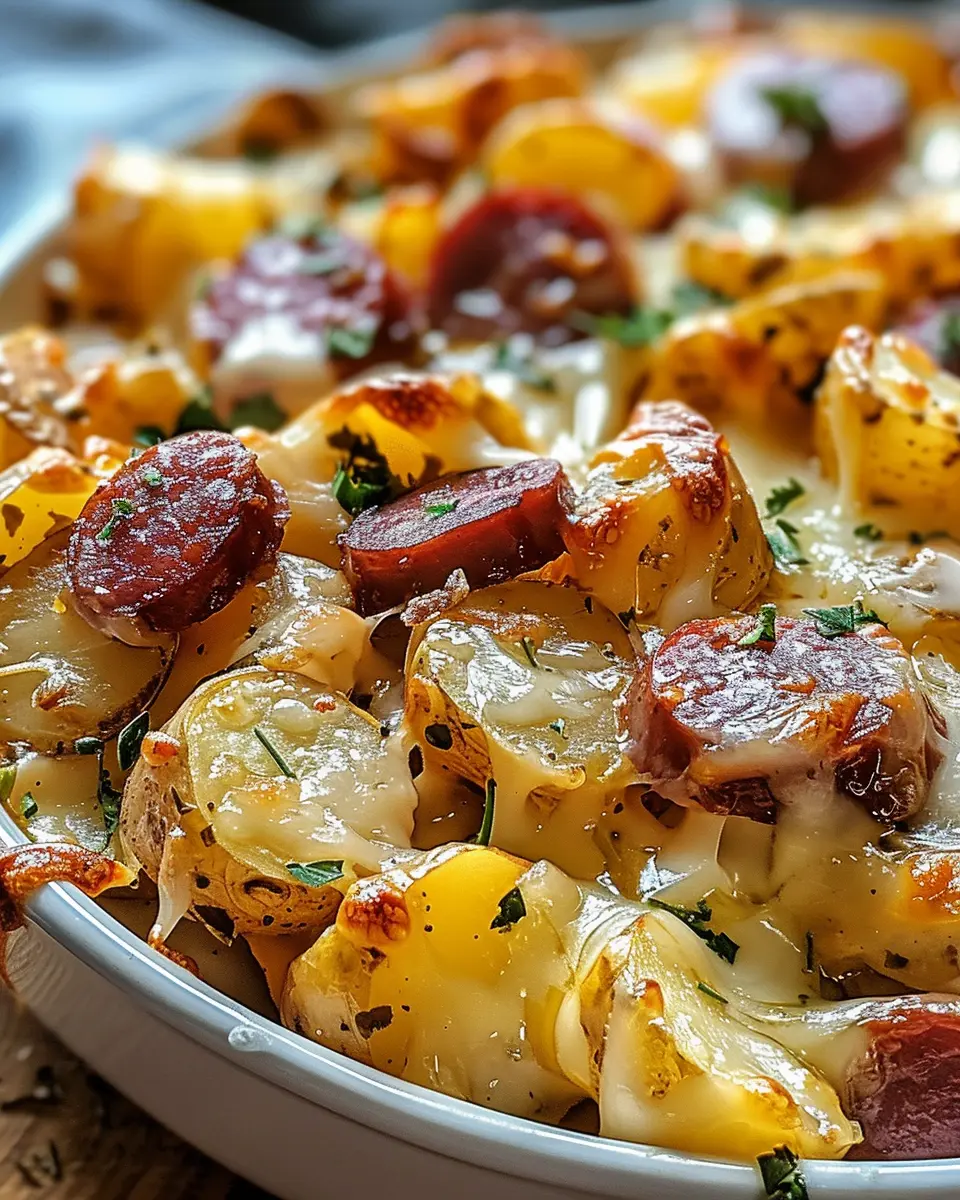 A delicious combination of cheesy ranch potatoes and smoked sausage, perfect for family dinners.