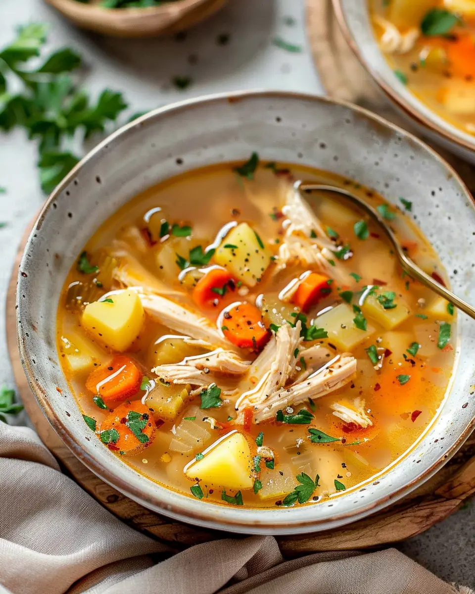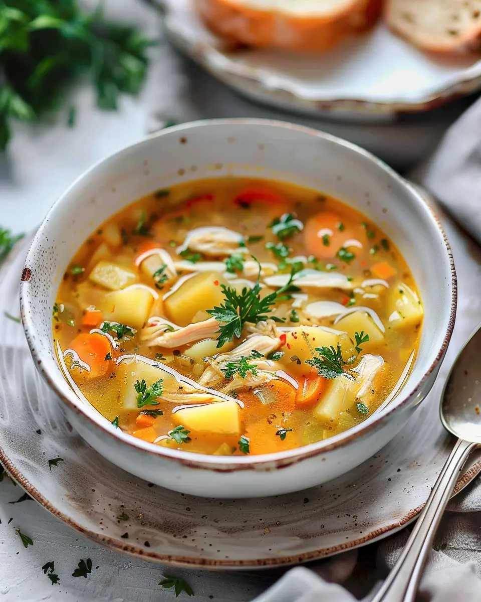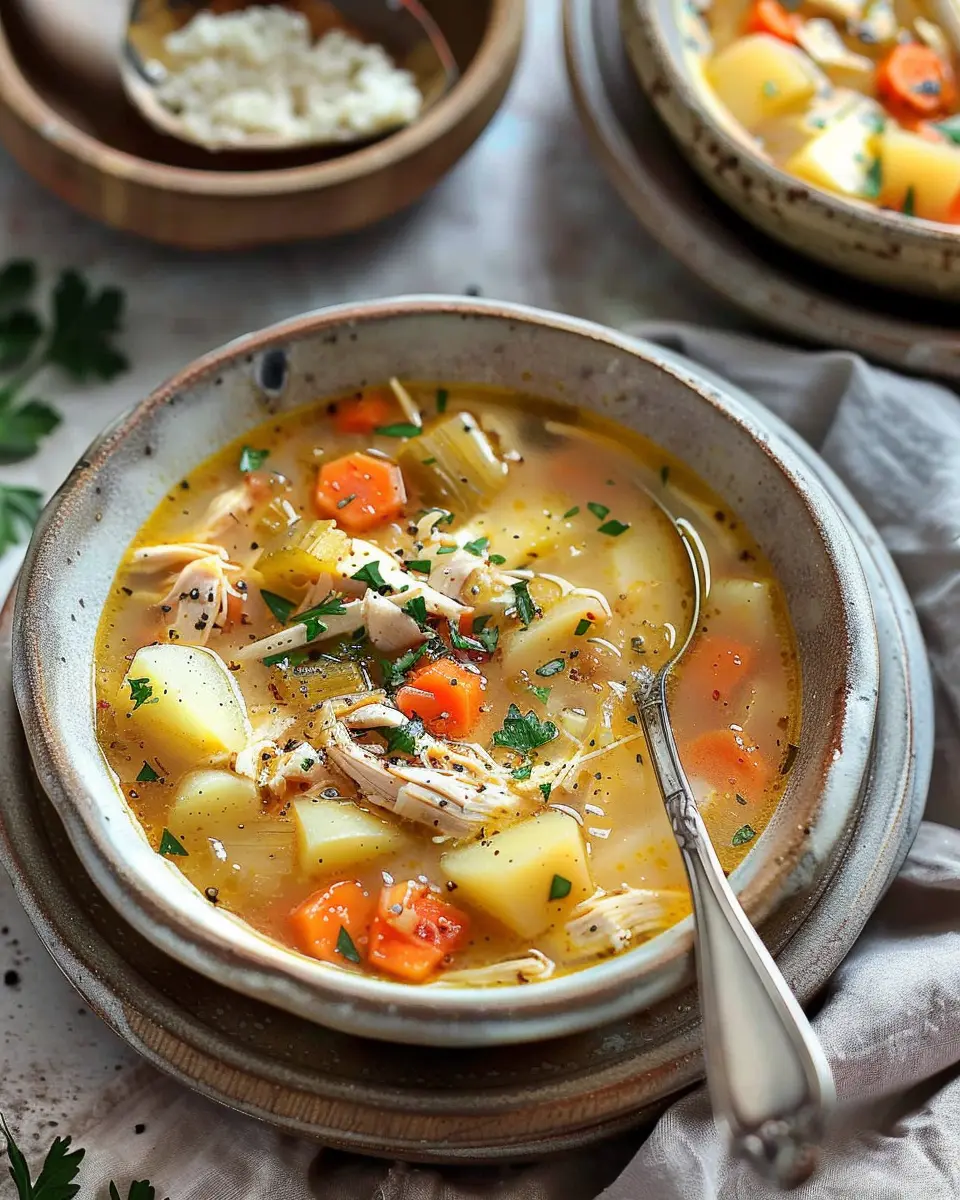 A warm and hearty chicken soup with potatoes, perfect for family meals.