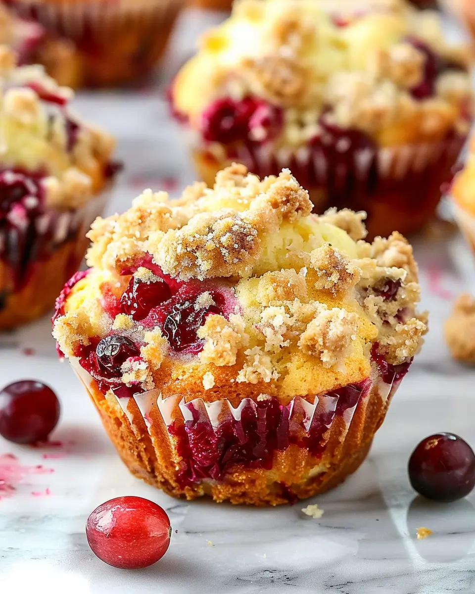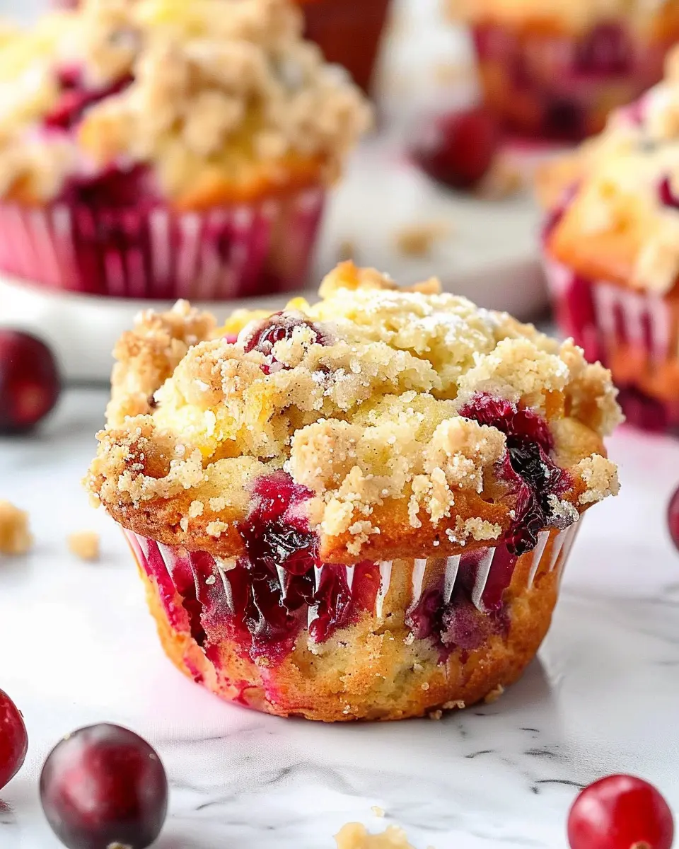 Delicious cranberry orange muffins topped with a sweet streusel, perfect for a morning treat.