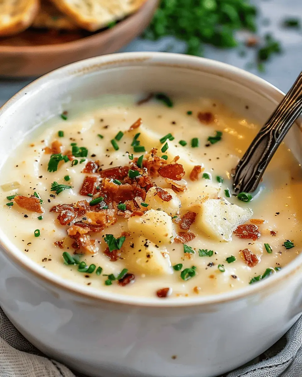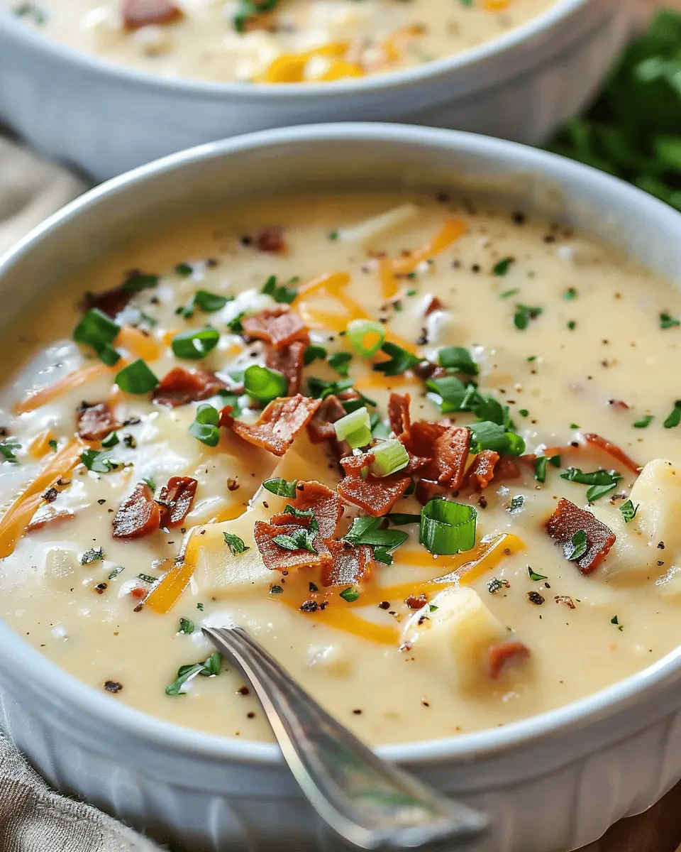 Now it’s time to make your masterpiece look as fantastic as it tastes! Ladle the soup into bowls and top it off with the crispy turkey bacon from earlier, additional cheese, and some sliced green onions or chives. If you want to elevate it even further, consider a dollop of sour cream on top. Your bowl of creamy loaded baked potato soup is now a sight to behold—and you can take a moment to admire your culinary success before diving in!