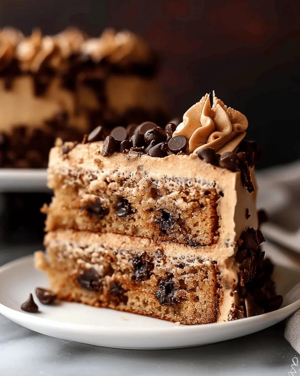 To assemble your espresso chocolate chip cake, place one layer on a serving plate and spread a generous amount of frosting on top. Add the second layer and frost the top and sides of the cake, ensuring it’s all nice and smooth.