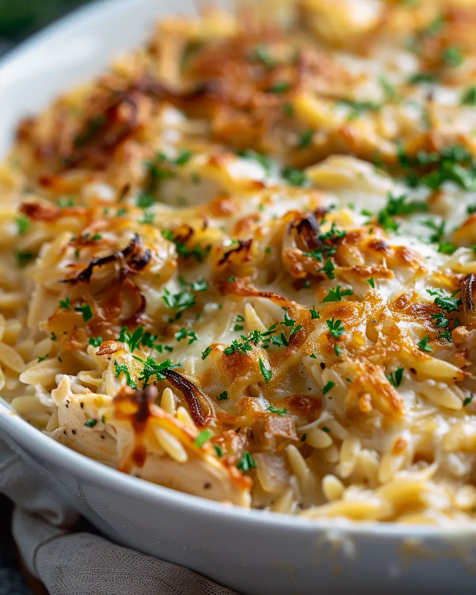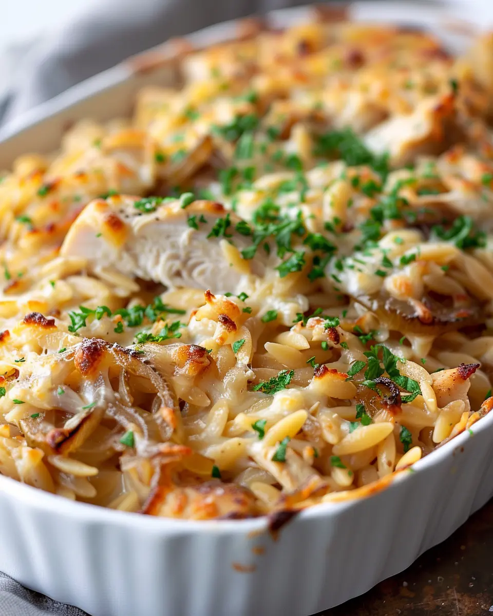 Keywords: French Onion Chicken, Orzo Casserole, Comfort Food, Cozy Dinner