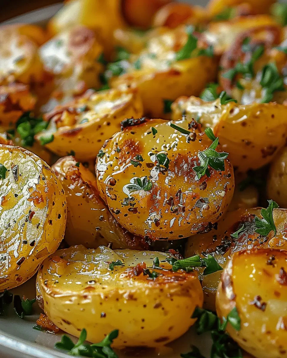 Once your garlic butter potatoes are roasted to perfection, it’s time for the finishing touches. Remove them from the oven, and while they’re still hot, sprinkle some fresh herbs on top for a burst of freshness.