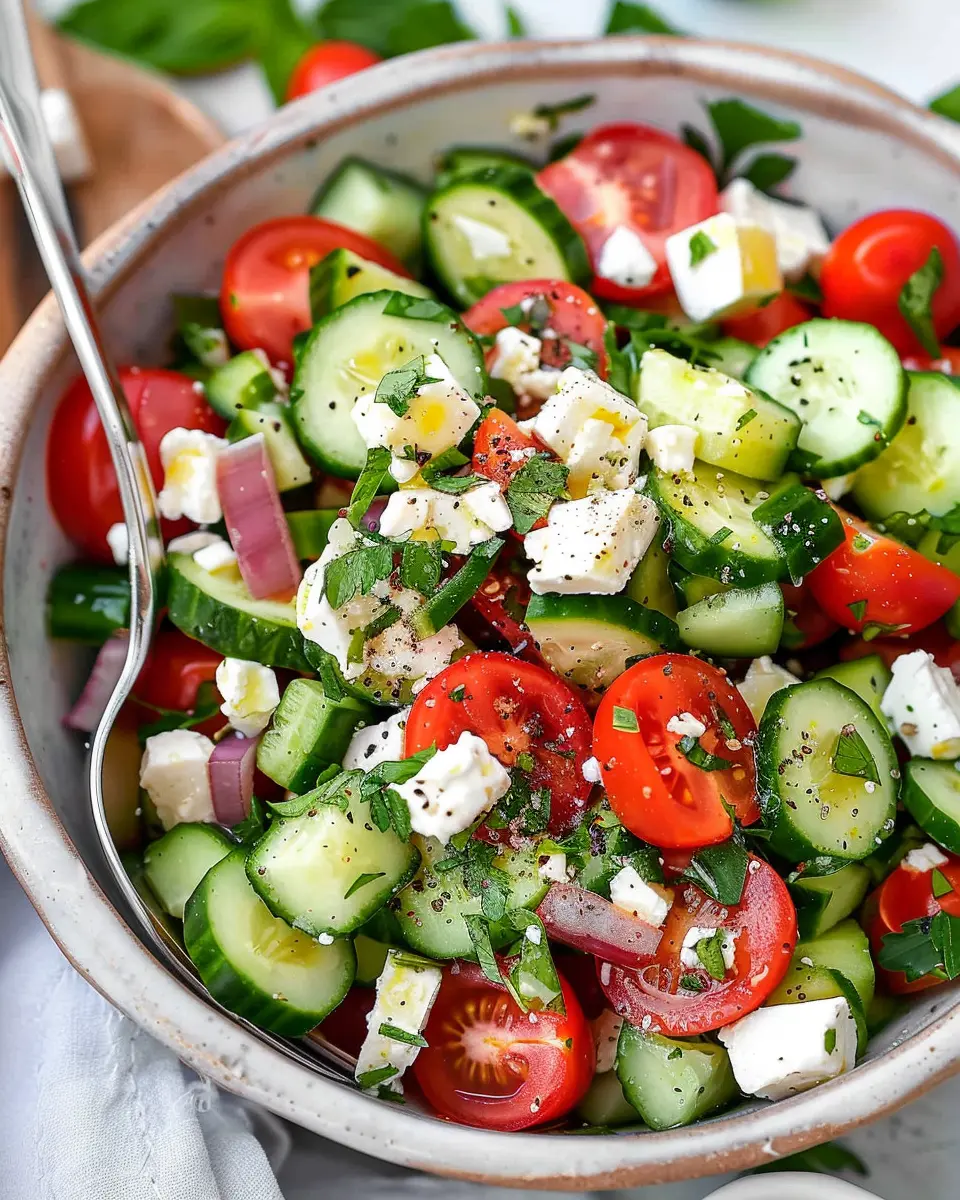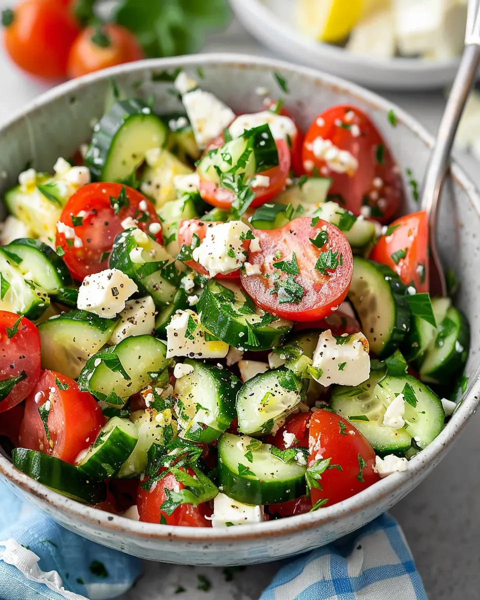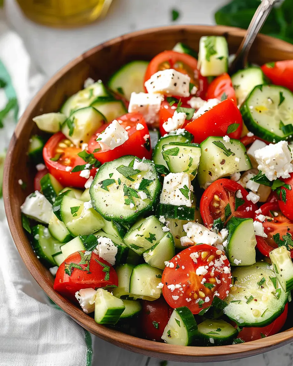 A light and refreshing salad featuring crisp cucumbers, juicy tomatoes, and tangy feta cheese, perfect for any occasion.