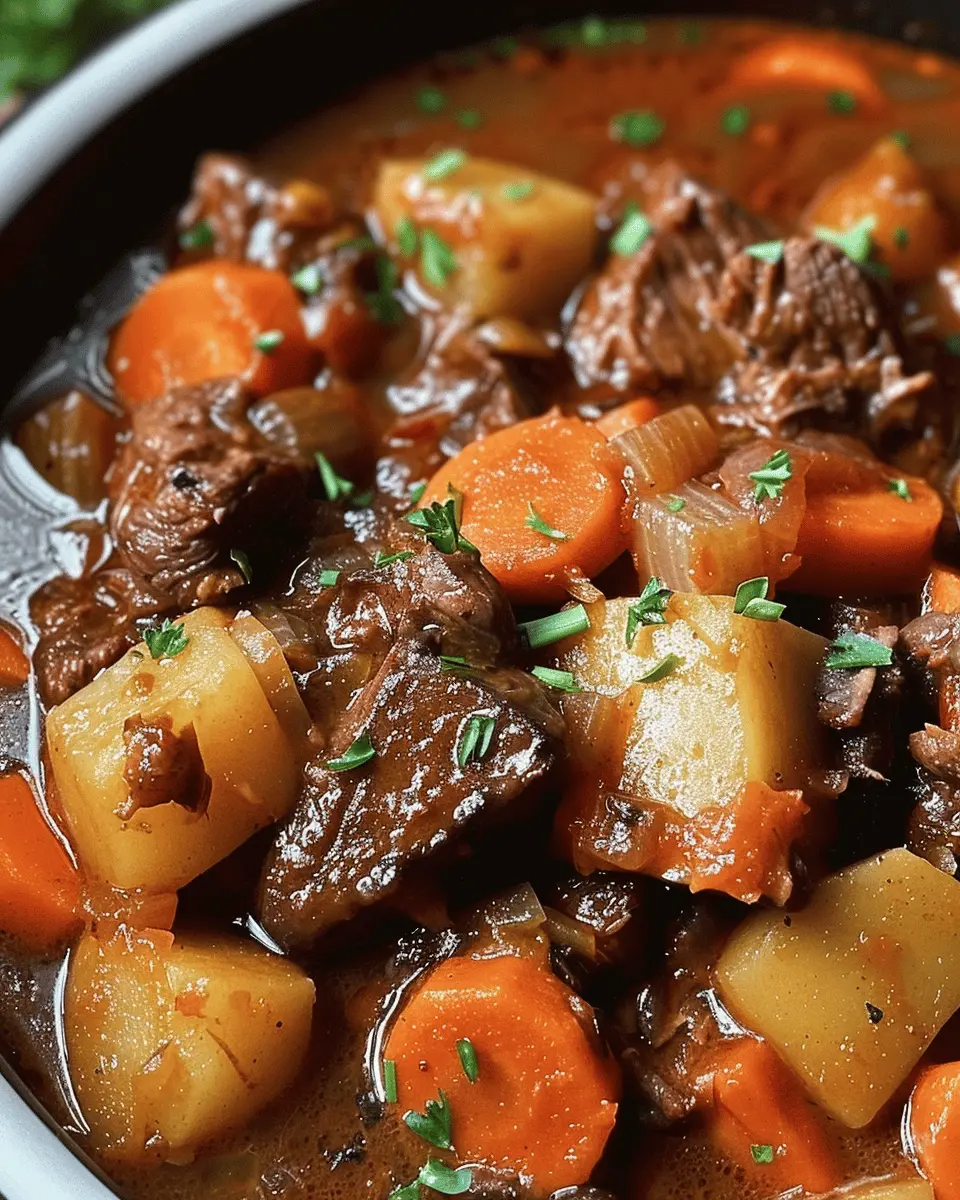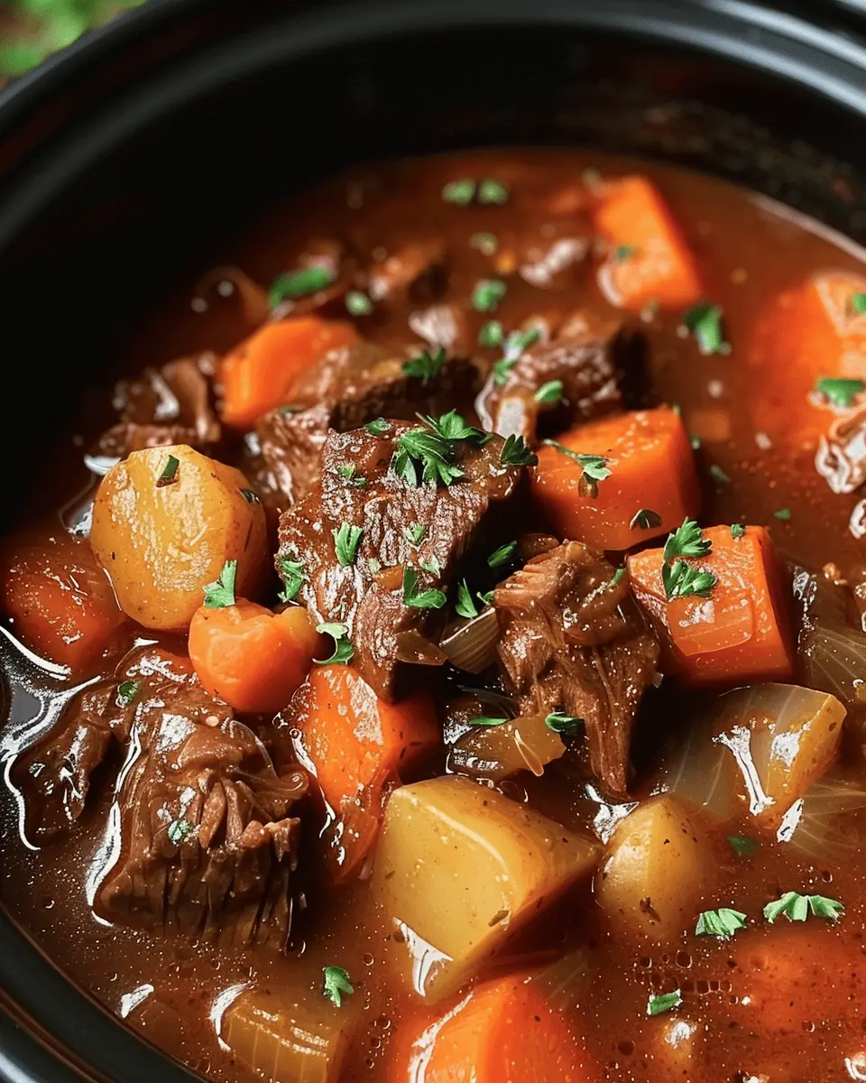 A warm and filling beef stew made in a crockpot, perfect for cold days.