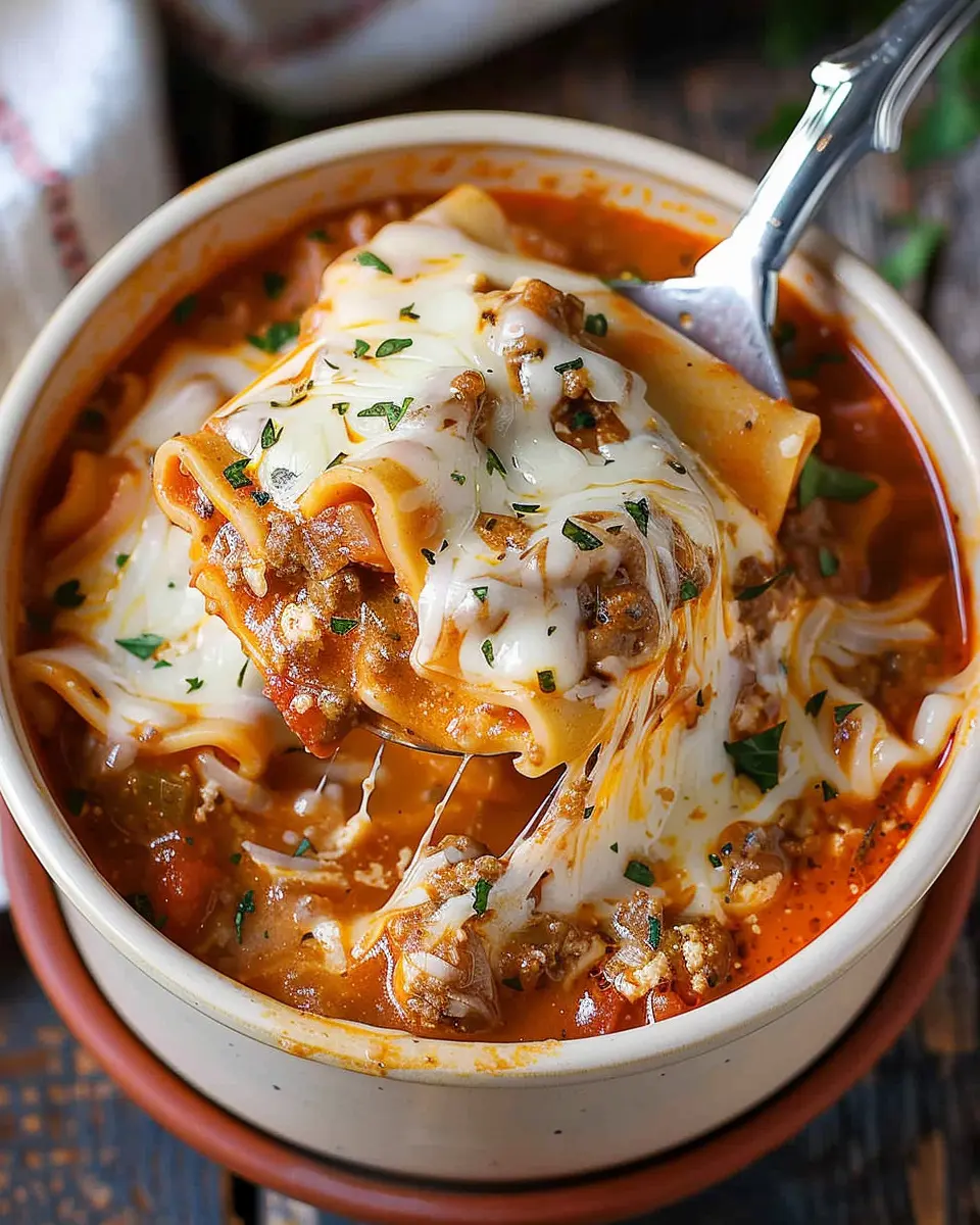 Serve your lasagna soup piping hot, garnishing it with fresh basil or a sprinkle of more cheese if desired. This step not only elevates the presentation but also enhances the flavor.