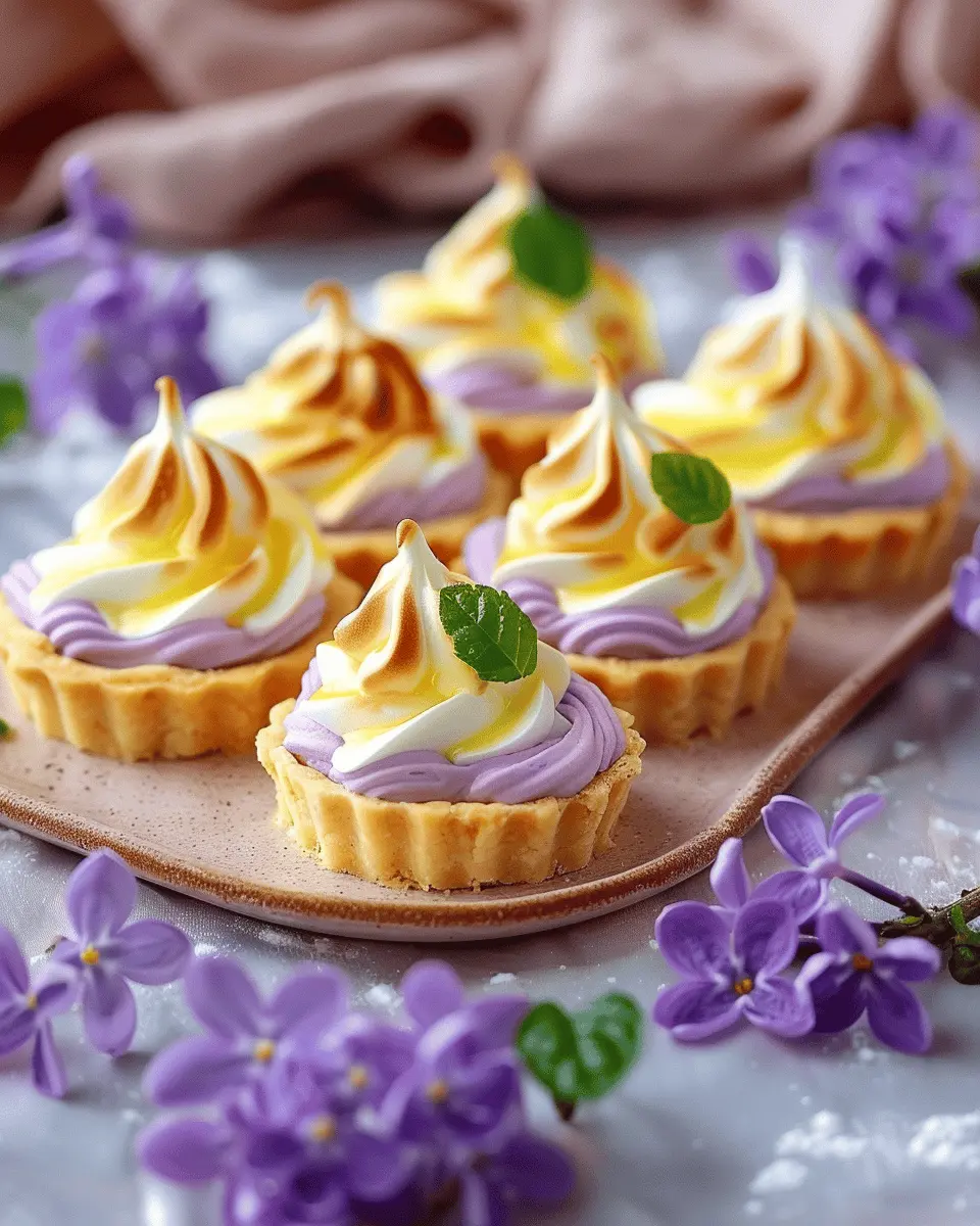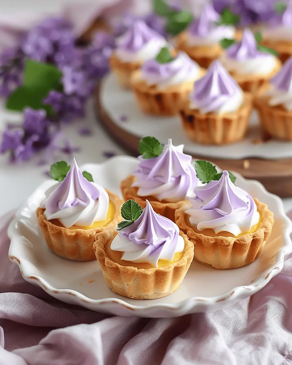 To make your mini lemon tarts even more appealing, serve them on a decorative platter garnished with fresh mint leaves or edible flowers. This adds a touch of elegance and showcases the beautiful lilac meringue topping!