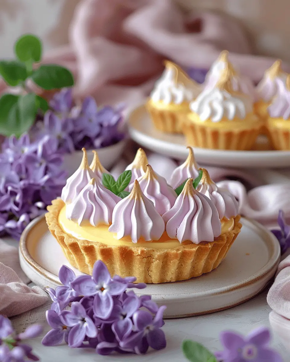 Keywords: Mini Lemon Tart, Lilac Meringue, Spring Dessert