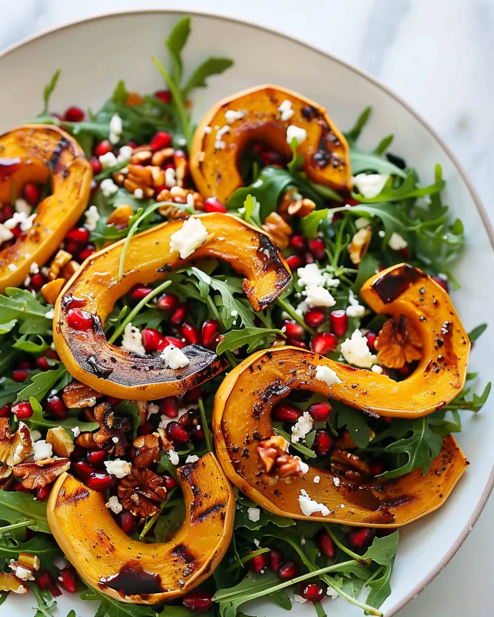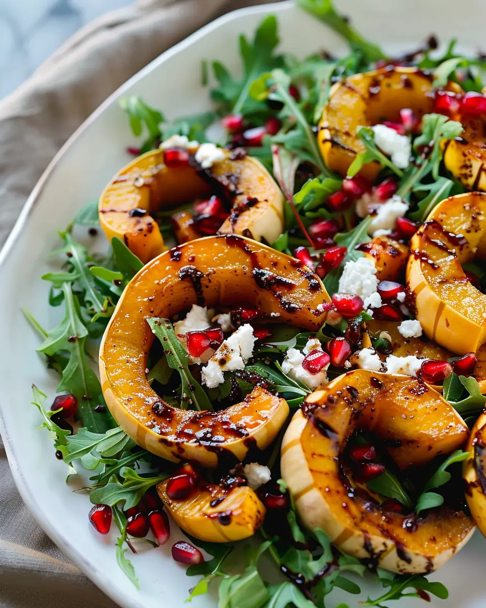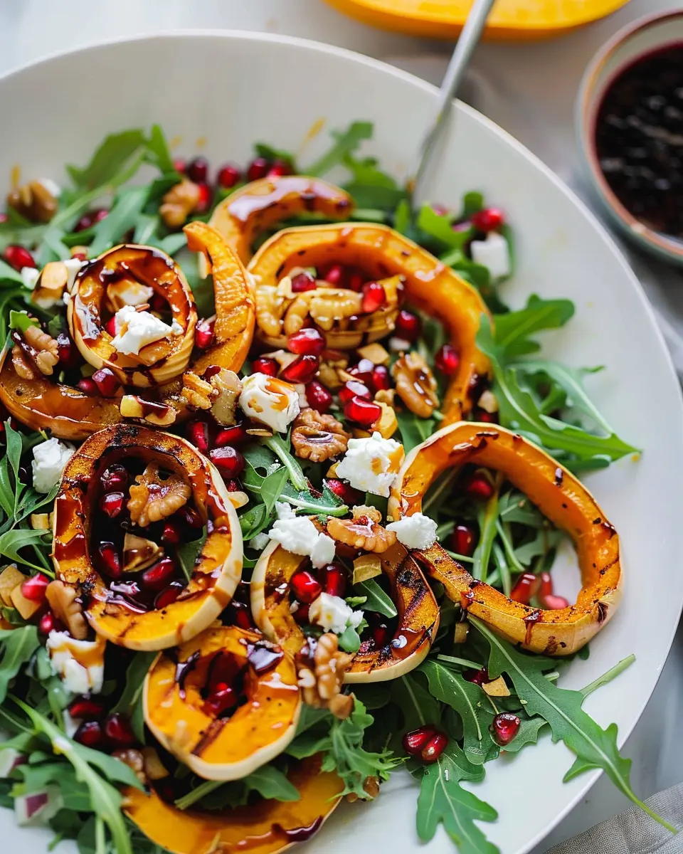 A delightful salad combining roasted delicata squash, fresh pomegranate, and peppery arugula for a perfect fall dish.