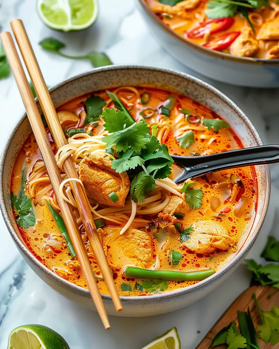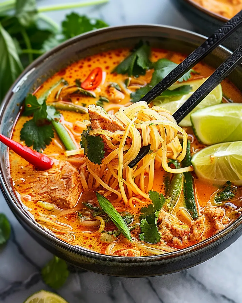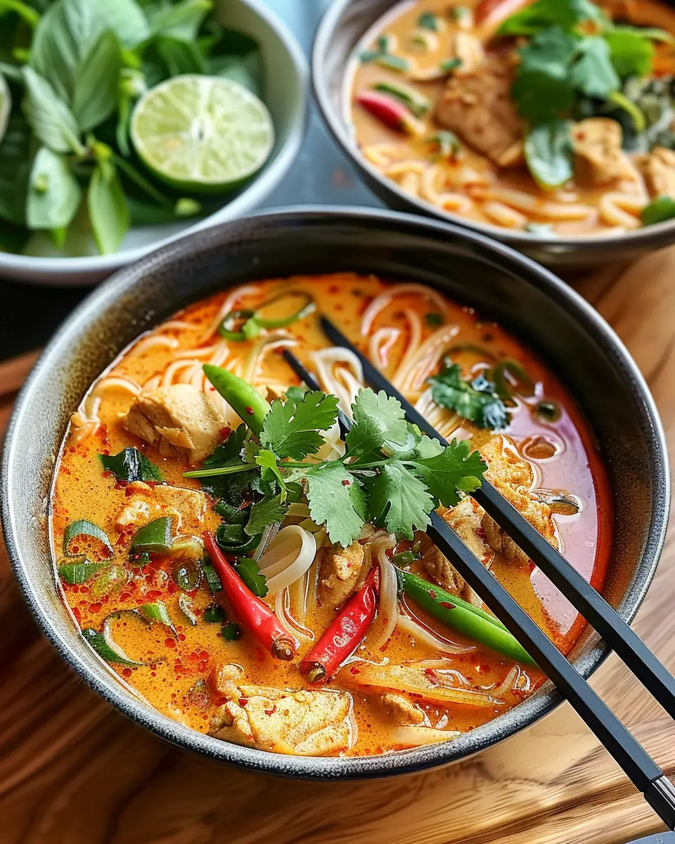 Your Thai Red Curry Noodle Soup is now ready to serve. Ladle it into bowls, garnish with fresh cilantro, and perhaps an extra lime wedge on the side. Enjoy this soul-warming dish with friends or simply savor it by yourself—it’s sure to become a staple in your kitchen!