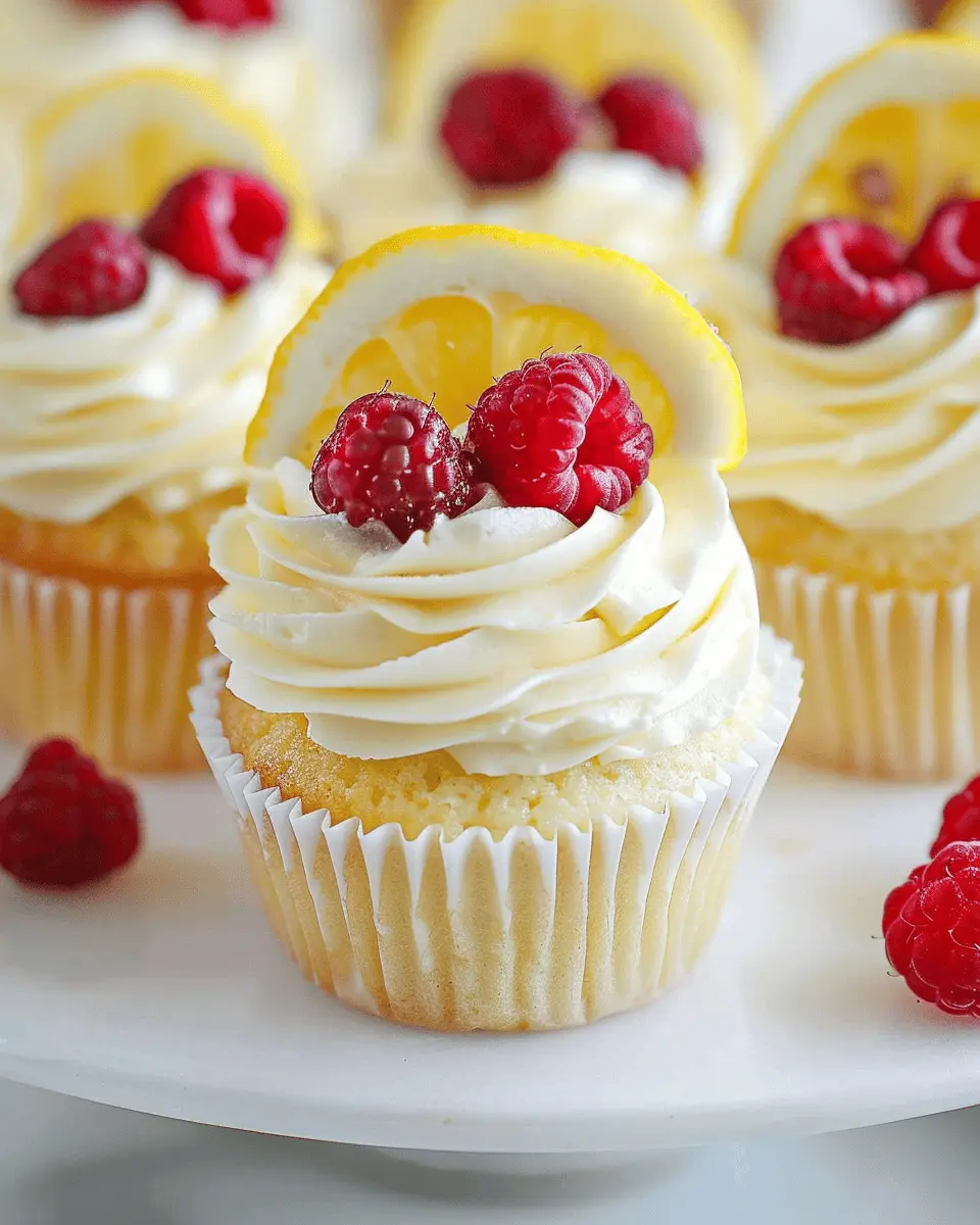 A delicious recipe for vanilla cupcakes topped with creamy lemon frosting and fresh raspberries.
